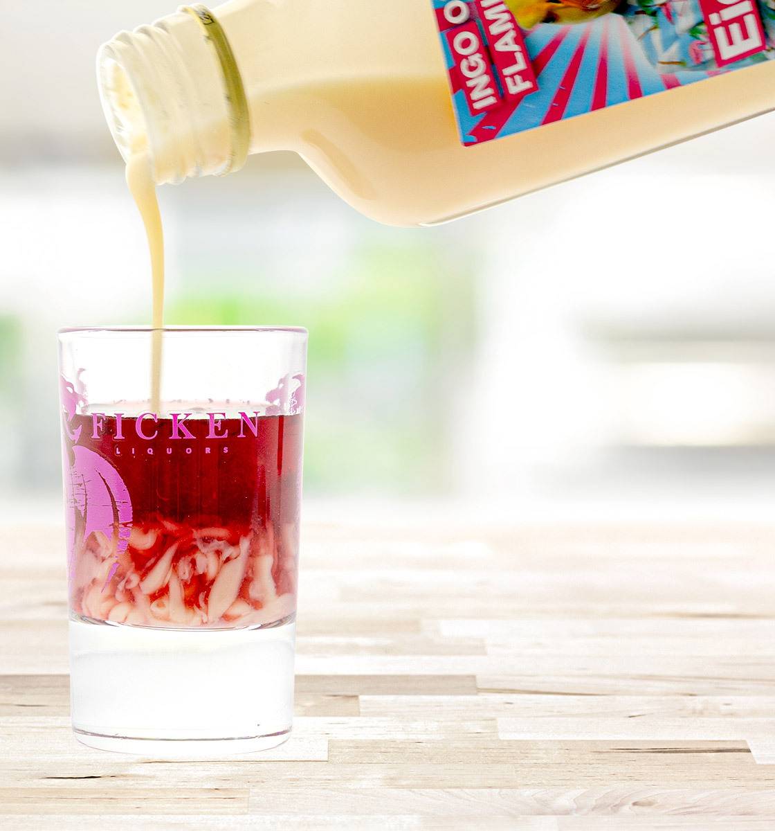 Für den klassischen "Hirnficken" nimmst du das beigefügte FICKEN Schnapsglas und füllst es zur Hälfte mit FICKEN auf und träufelst dann vorsichtig den Eierlikör ein, bis das Glas voll ist!