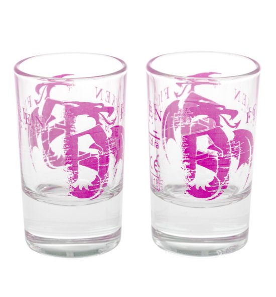 Hier bekommst du 2 original FICKEN Schnapsgläser mit pinkem Drachen-Logo in einer coolen schwarzen Geschenkbox, die ebenfalls mit dem pinken Drachen verziert ist.