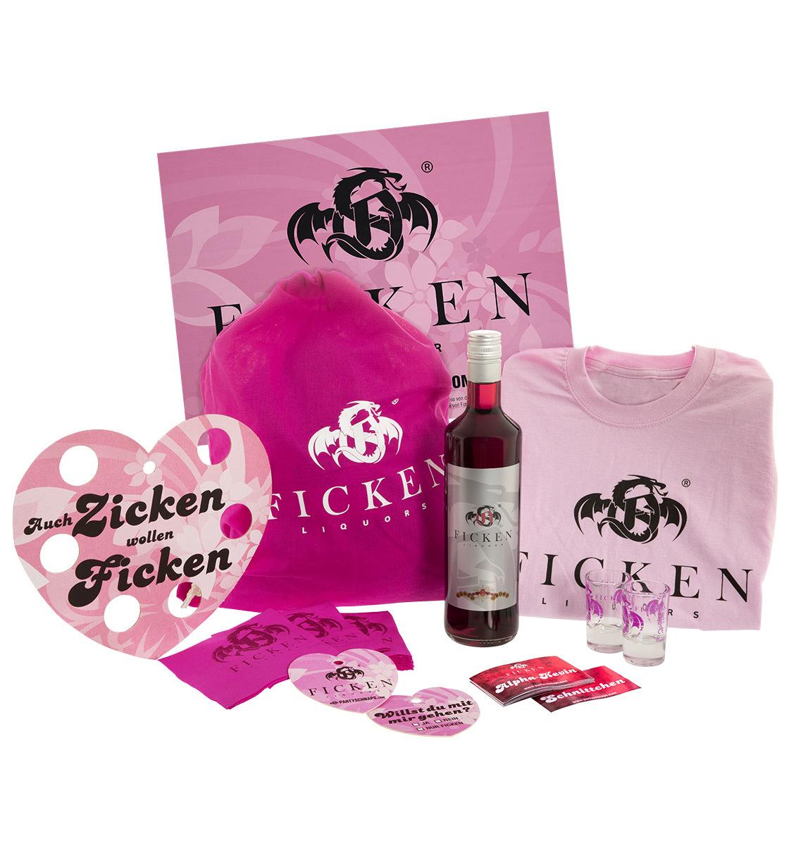 Ganz schön pink hier, was? Dieses Paket beinhaltet eine tolle Auswahl an Utensilien, die du für eine coole Party brauchst. Eine Flasche FICKEN Partyschnaps, 2 coole Shotgläser, das passende Shirt, Bierdeckel und Tablett in Herzform, ein Schild, Servietten, witzige Aufkleber und einen Turnbeutel, in dem du das alles verstauen kannst.