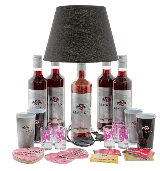 Mit der limitierten FICKEN Flaschenlampe mit rotem Sand kommen die echten Rampensäue ans Licht und weil die gewöhnlich ordentlich Durst haben, legen wir noch ordentlich Partyschnaps, passende Trinkgefäße und witzige Sticker plus Bierdeckel mit dazu.