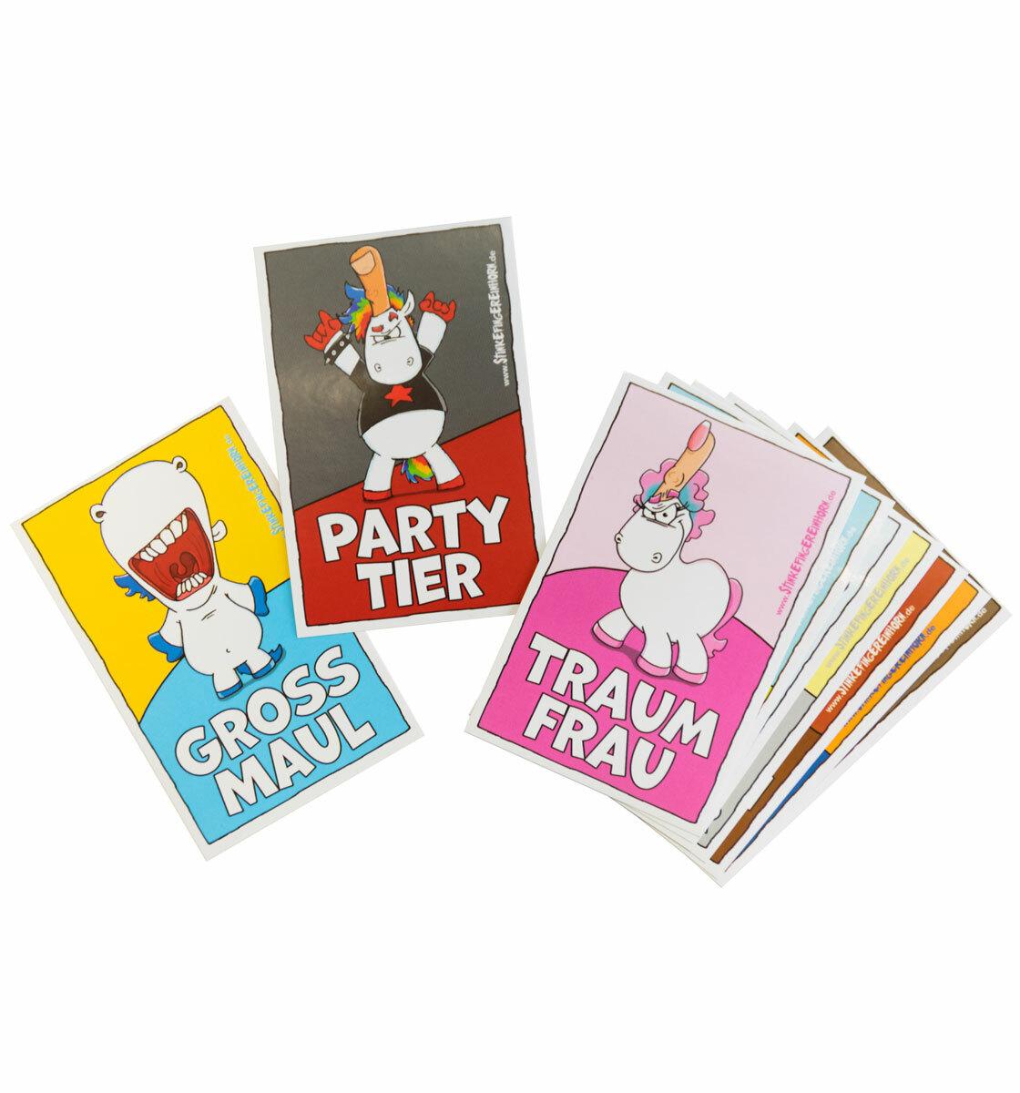 Das Stinkefingereinhorn ist viel, aber nicht eintönig. Darum gibt es jetzt 9 verschiedene Charakter-Aufkleber mit passenden Stinkefingereinhorn Motiven, mit denen du dich und deine Freunde bekleben kannst.